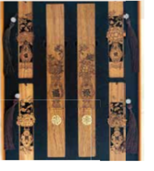 Crafted from sour branch wood using intricate hollow-out and inlay techniques, 4 intricate "Fu, Lu, Shou, Xi" (Blessings, Prosperity, Longevity, Happiness) bookmarks are crafted with hollow-out techniques. A pair of "Fu Lu" (Blessings, Prosperity) showcases the artistry of copper inlay. The ends of the ornaments are engraved with the iconic "Liu Zi Zheng Tou" (Six Children Vying for the Foremost) design, a signature work of the renowned Wuqiang New Year's painting tradition. "Hua Kai Fu Gui" (Flowers Blossoming in Abundance and Prosperity) is a masterpiece of Wuqiang New Year's painting. The vase displays an abundance of peonies, chrysanthemums, and other auspicious blooms, symbolizing wealth, longevity, and marital harmony. Complementing the floral arrangement are symbolic fruits such as peaches, Buddha's hand citron, pomegranates, and lotus roots, conveying wishes for multifaceted prosperity and progeny. The central inscription of "Fu Lu Shou Xi" (Blessings, Prosperity, Longevity, Happiness) eloquently encapsulates the overarching theme of this exquisite collection.