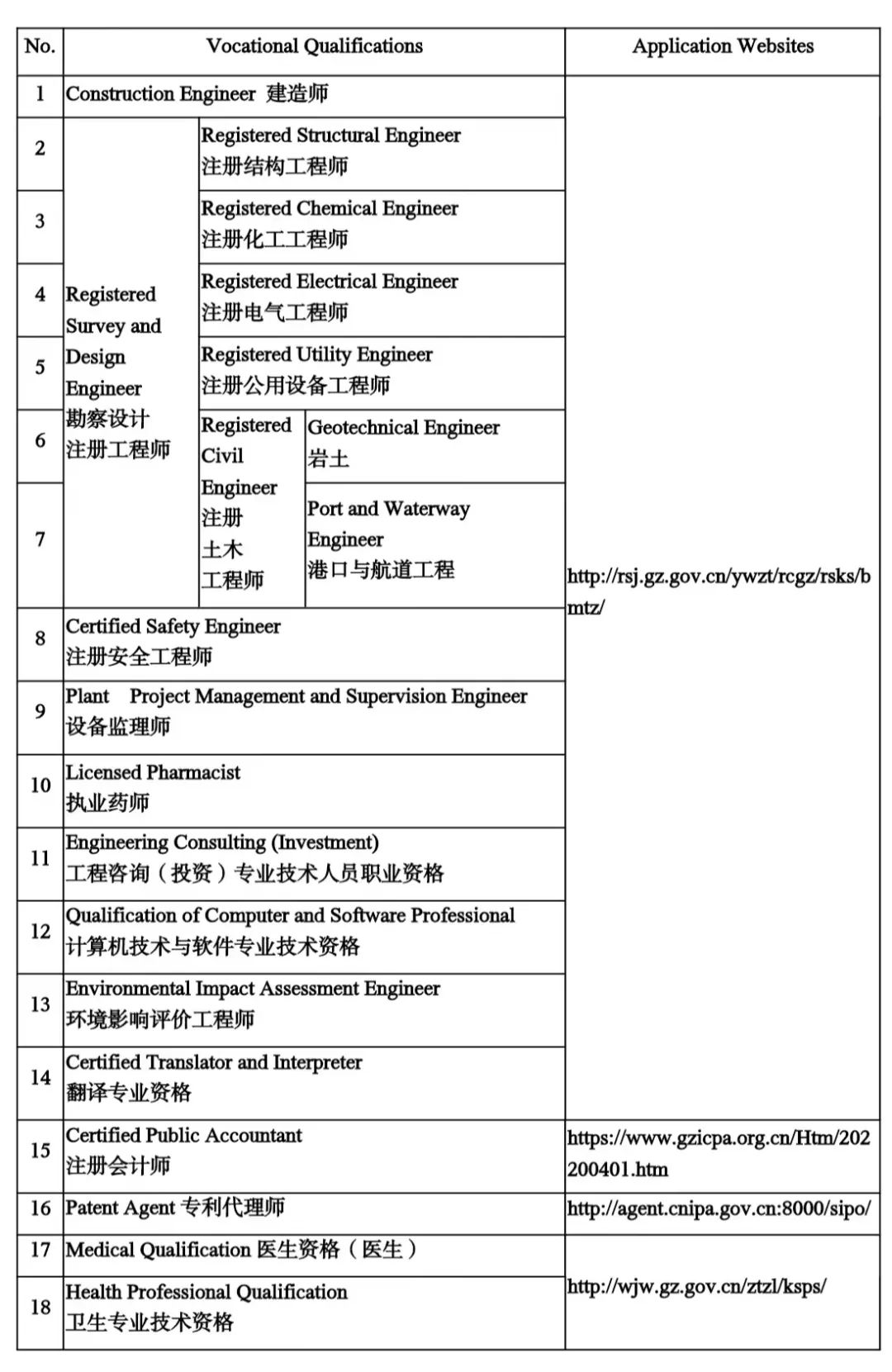 Foreign residents in Guangzhou can obtain 18 kinds of vocational qualification certificates through examinations, mainly including construction engineer, chemical engineer, electrical engineer, licensed pharmacist, qualification of computer and software professional, certified translator and interpreter, certified public accountant, patent agent, and medical qualification.
