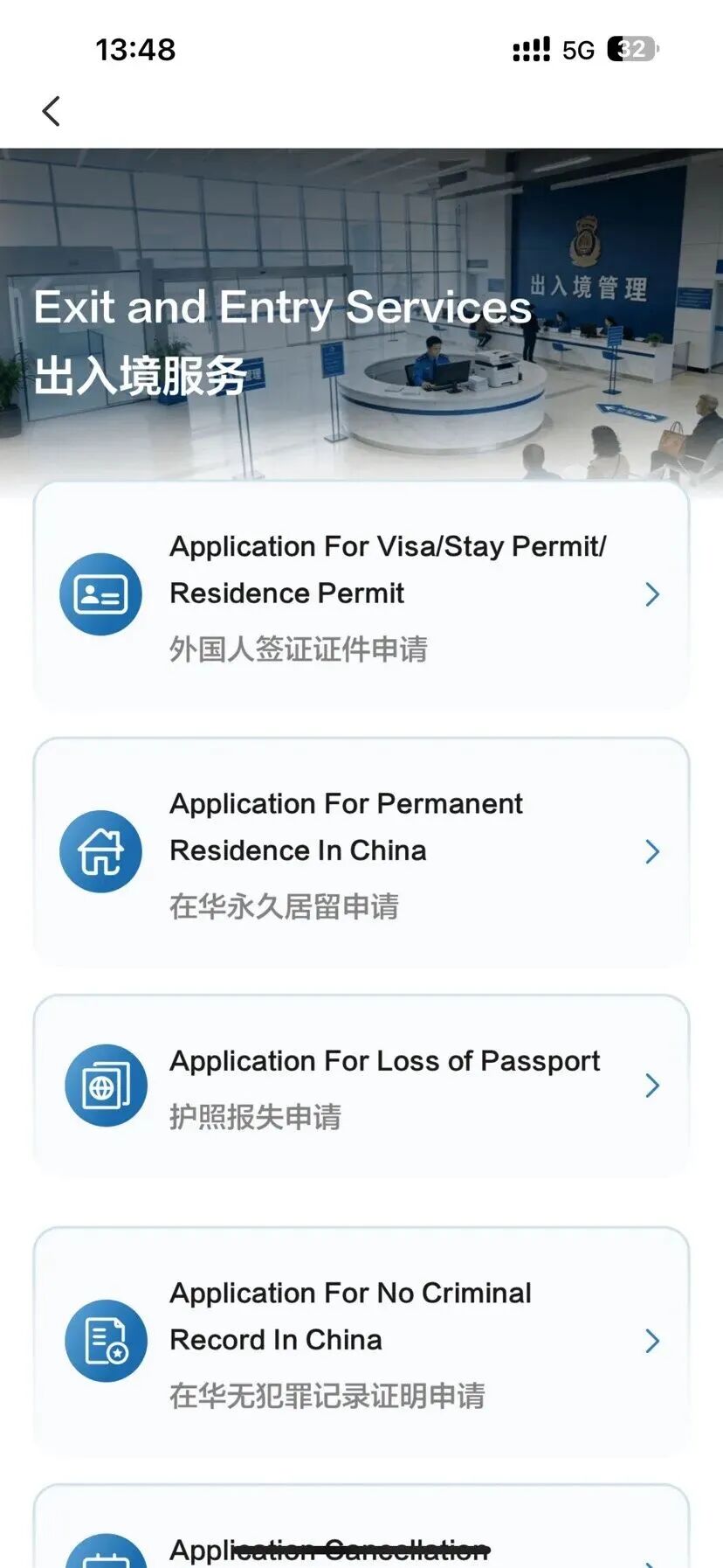 With the new rollout, users can access a range of services through the app, including applications for a visa, a stay permit, a residence permit, permanent residence in China, loss of passport, no criminal record in China, self-service accommodation registration, as well as booking and cancellation of applications.