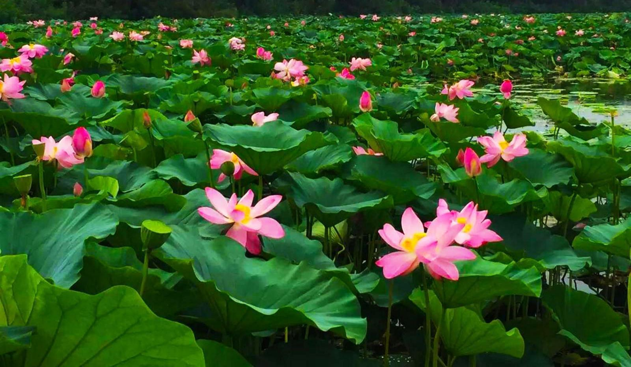 During the height of summer,the lotus lake in the Beiling Parkenters its best viewing season.Among the green leaves,the pink and white petals of lotus flowersintermingle with the deep red ones,recreating the poetic scene of"green lotus leaves outspreadas far as boundless sky".